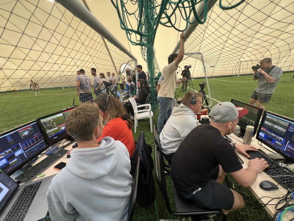 Мы организовали многокамерную трансляцию с двух футбольных полей одновременно. На каждом работали 3 стационарные камеры, а также один оператор со стедикамом, который обеспечивал плавные динамичные планы для создания отчетного ролика и подсъём интервью с участниками.